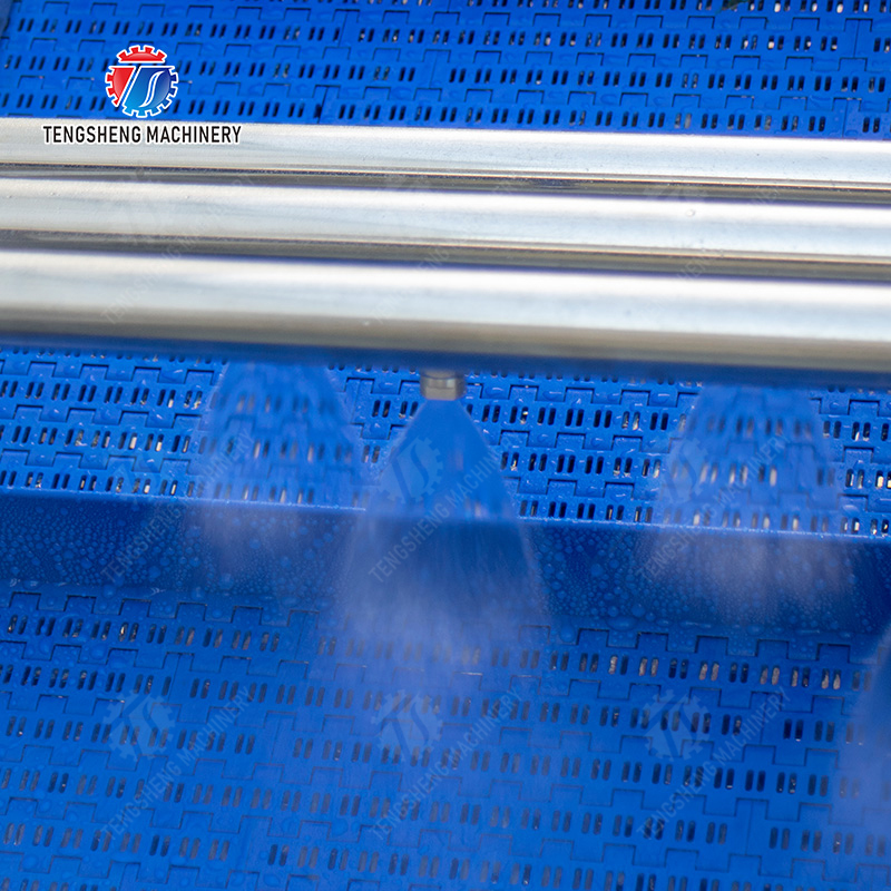 Η ζώνη μεταφορέων του ανελκυστήρα αποτελείται από το υλικό βαθμού τροφίμων POM, το οποίο ανταποκρίνεται στα πρότυπα βαθμού τροφίμων. Η ταχύτητα μπορεί να ρυθμιστεί κατά βούληση και είναι εύκολο να καθαρίσει